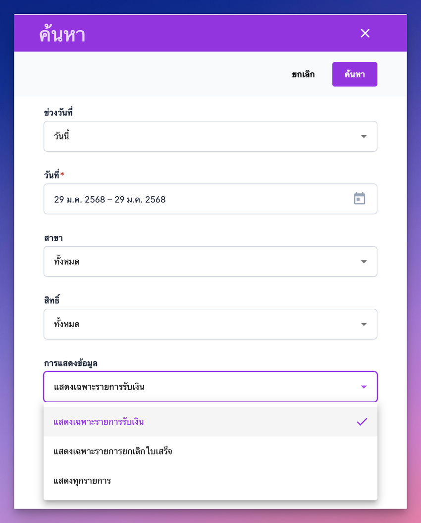 - แสดงเฉพาะรายการยกเลิกใบเสร็จ - ระบบจะแสดงเฉพาะข้อมูลการรับเงินและรายการที่ยกเลิกใบเสร็จ
