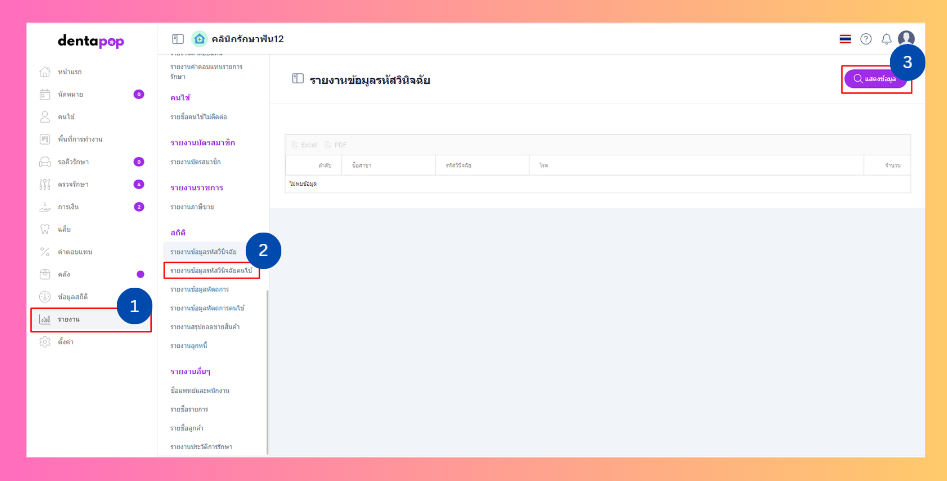 รายงานข้อมูลรหัสวินิฉัยคนไข้คือเอกสารที่ระบุรหัสวินิฉัยคนไข้หรือการวินิจฉัยทางการแพทย์ของคนไข้ สามารถทำได้ตามขั้นตอนนี้