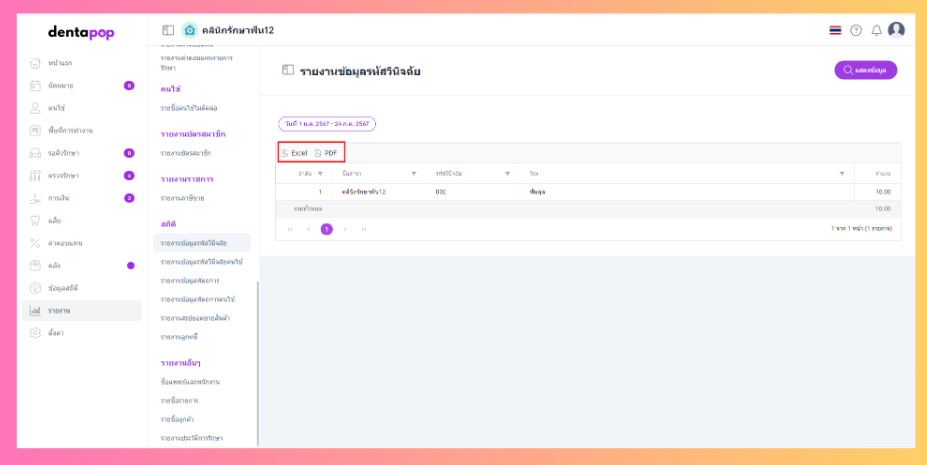 - ระบบจะแสดงข้อมูลรายงานข้อมูลรหัสโรคคนไข้ สามารถพิมพ์เอกสารออกมาได้เป็นไฟล์ Excel และ PDF