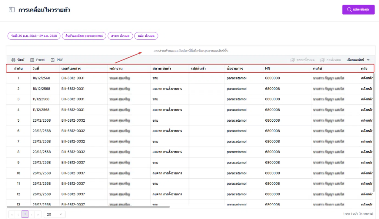 ผู้ใช้งานสามารถลากส่วนหัวของคอลัมน์เพื่อจัดตามกลุ่มของคอลัมน์ได้