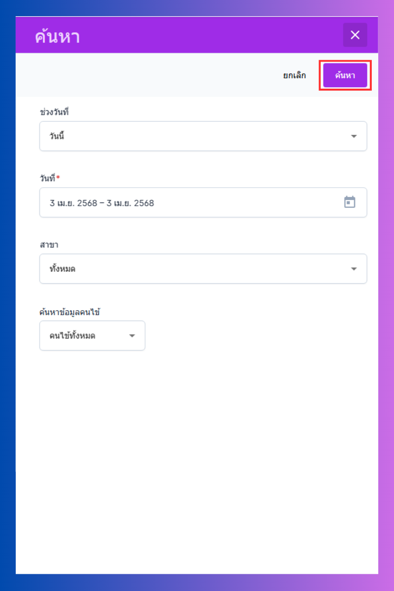 จากนั้นจะมีหน้าต่างค้นหาขึ้นมาผู้ใช้สามารถระบุช่วงวันที่ วันที่ สาขา เลือกค้นหาชื่อคนไข้หรือค้นหาทั้งหมด เพื่อดูรายละเอียดจากนั้นกดค้นหา