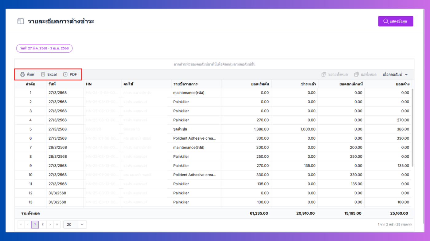 รายละเอียดค้างชำระจะแสดง รายชื่อลูกค้าที่มีรายการค้างชำระ ตามที่ผู้ใช้งานค้นหาตามวันที่
