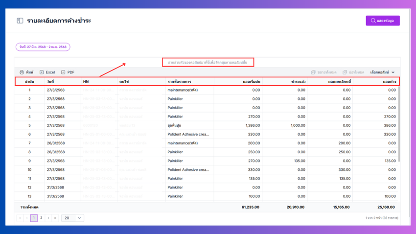 สามารถลากในส่วนหัวของคอลัมน์เพื่อจัดกลุ่มตามคอลัมน์นั้นได้