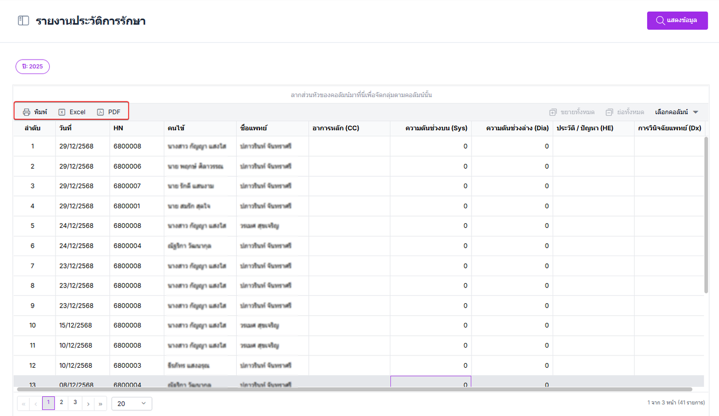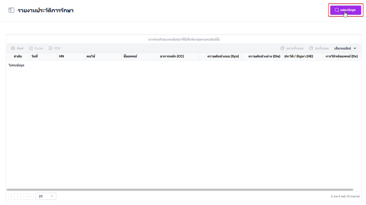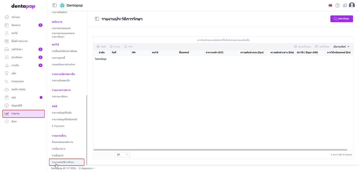 ผู้ใช้งานเลือกหัวข้อ รายงานประวัติการรักษา