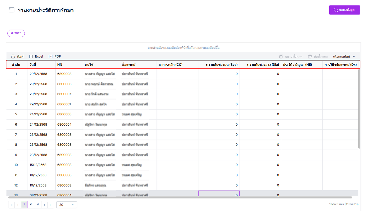 ระบบจะแสดงข้อมูลตามที่ผู้ใช้งานค้นหา โดยจะแสดงหัวข้อคอลัมน์ดังนี้