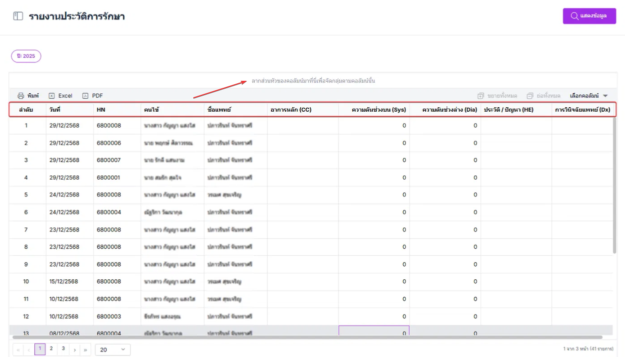 ผู้ใช้งานสามารถลากส่วนหัวของคอลัมน์เพื่อจัดตามกลุ่มของคอลัมน์ได้