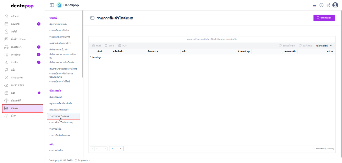 ผู้ใช้งานเลือกหัวข้อ รายการสินค้าใกล้หมด