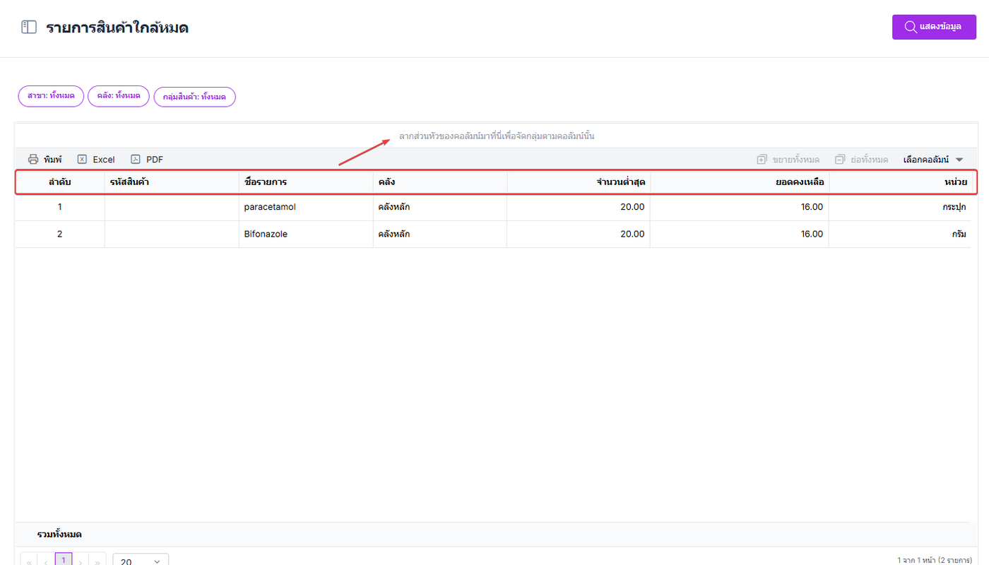 ผู้ใช้งานสามารถลากส่วนหัวของคอลัมน์เพื่อจัดตามกลุ่มของคอลัมน์ได้