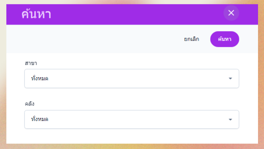 คลิกที่แสดงข้อมูล จากนั้นจะมีหน้าต่างค้นหาขึ้นมา ผู้ใช้เลือก สาขา คลัง จากนั้นกดค้นหา