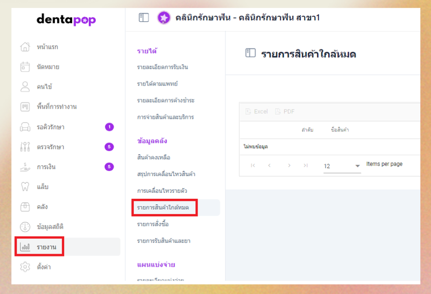 2.เลือกหัวข้อข้อมูลคลัง > รายการสินค้าใกล้หมด