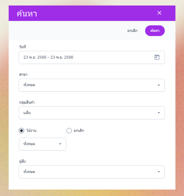 สามารถระบุกลุ่มสินค้าที่ต้องการค้นหารวมถึงสินค้าที่ใช้งานหรือยกเลิกไปแล้ว และสามารถระบุสินค้าเป็นรายตัวได้
