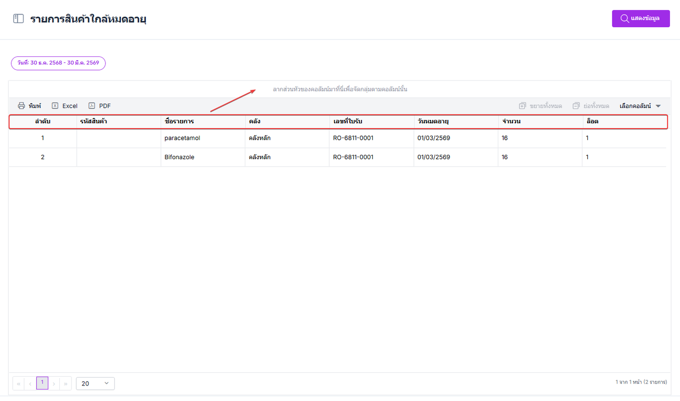 ผู้ใช้งานสามารถลากส่วนหัวของคอลัมน์เพื่อจัดตามกลุ่มของคอลัมน์ได้