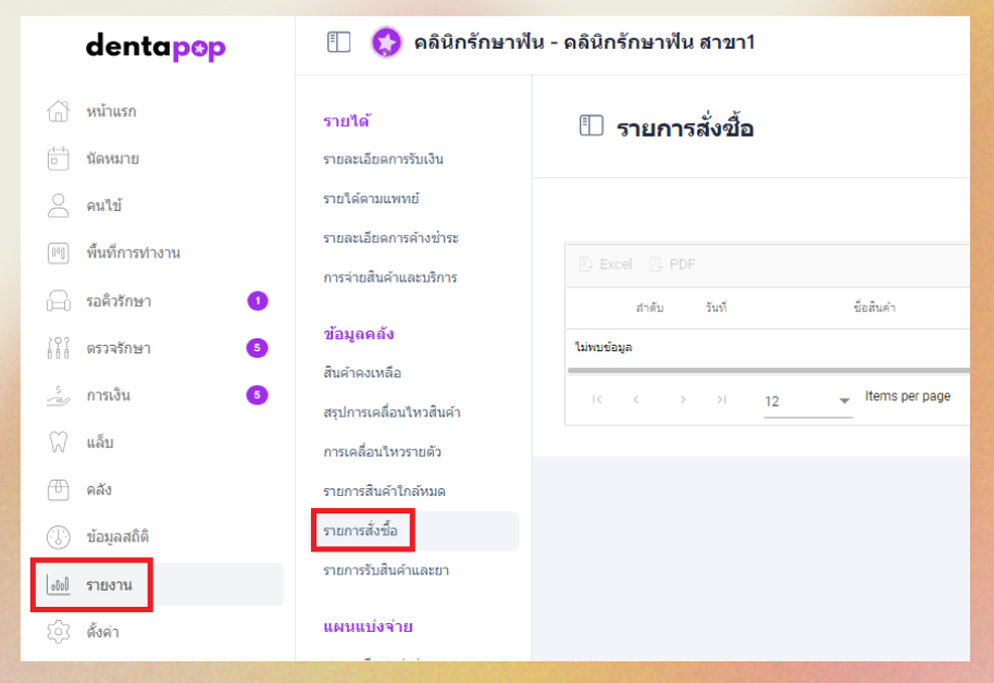2.เลือกหัวข้อข้อมูลคลัง > รายการสั่งซื้อ
