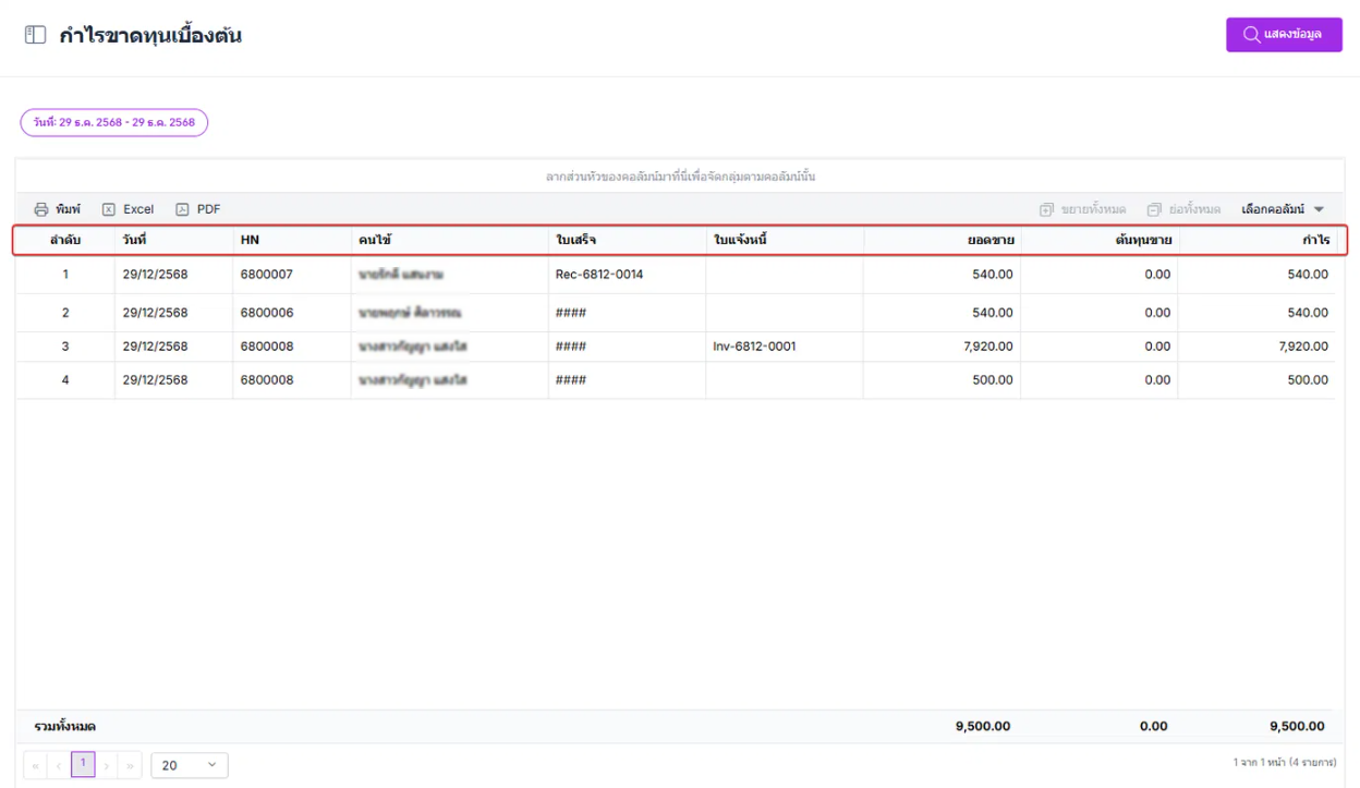 "กำไรและขาดทุนเบื้องต้น" หมายถึง ภาพรวมเกี่ยวกับผลกำไรหรือขาดทุนที่เกิดขึ้นในธุรกิจหรือกิจกรรมทางการเงินในระยะเวลาเฉพาะ ๆ โดยทั่วไป, มักถูกระบุในรายงานการเงินหรือสถิติการเงิน โดยจะเก็บข้อมูล วันที่ ชื่อคนไข้ เลขใบเสร็จ ใบแจ้งหนี้ ชื่อสินค้าที่ทำรายการ และจะยอดขายมาหักลบกับต้นทุนขาย และจะคิดกำไรออกมาให้ว่าติดลบหรือกำไรเท่าไหร่
