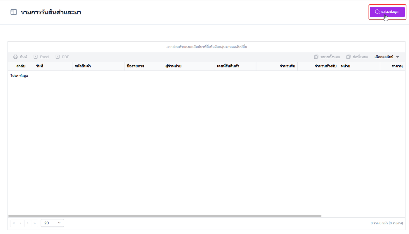 ผู้ใช้งานเลือกหัวข้อ รายการรับสินค้าและยา