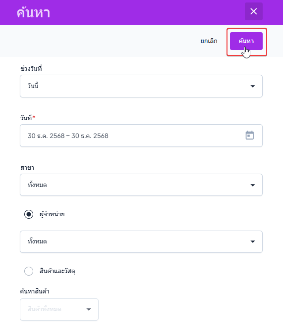 เมื่อกำหนดเงื่อนไขครบถ้วนแล้ว ผู้ใช้งานสามารถดำเนินการค้นหาเพื่อแสดงผลรายงานตามเงื่อนไขที่เลือก