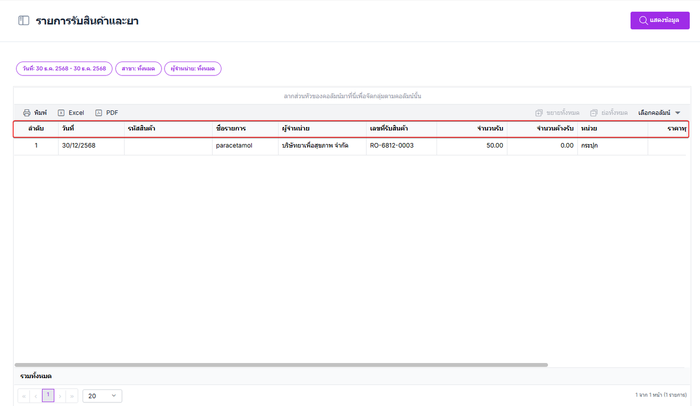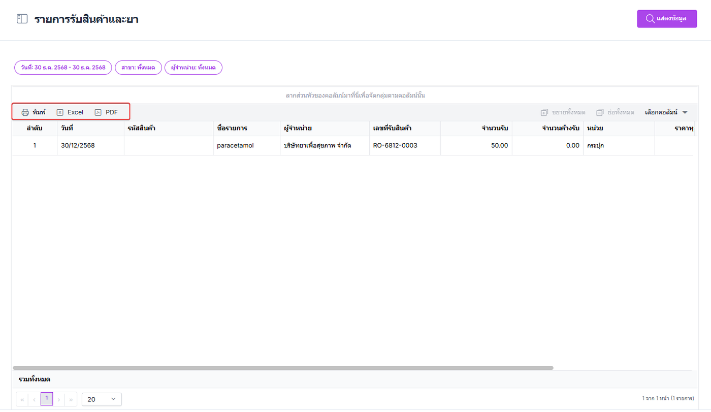 รายการรับสินค้าและยา