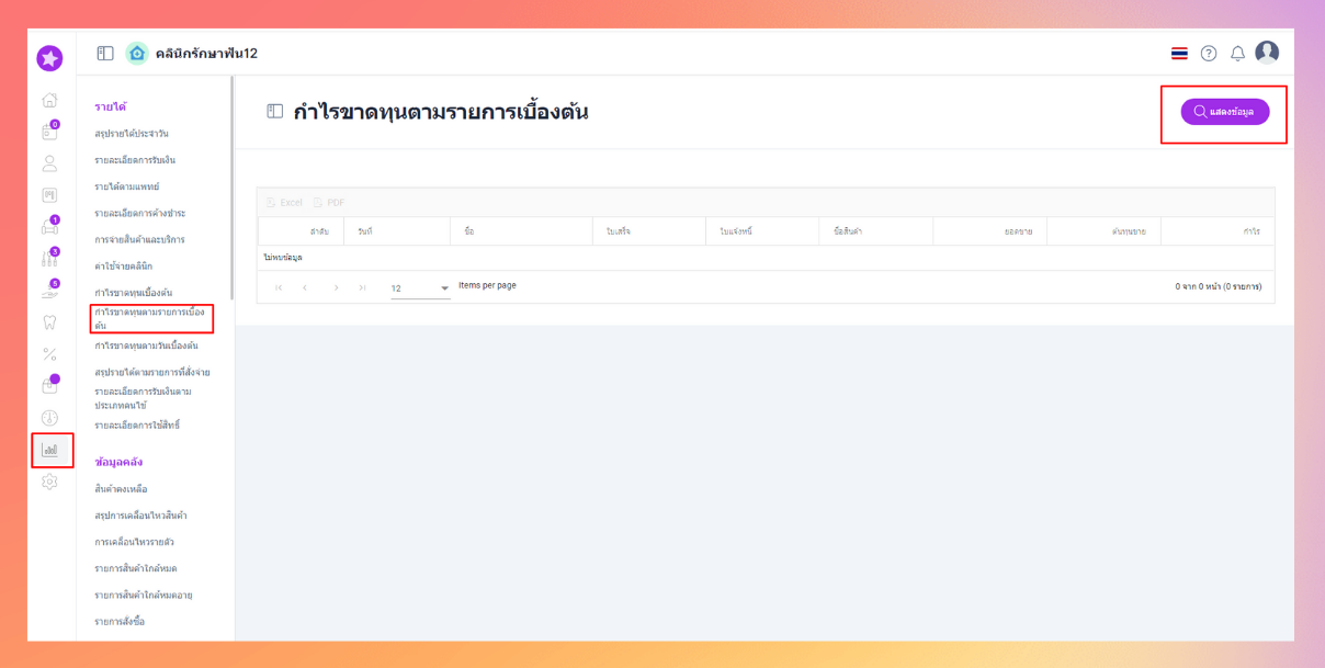 ไปที่รายงาน > เมนูรายได้ > กำไรขาดทุนตามรายการ