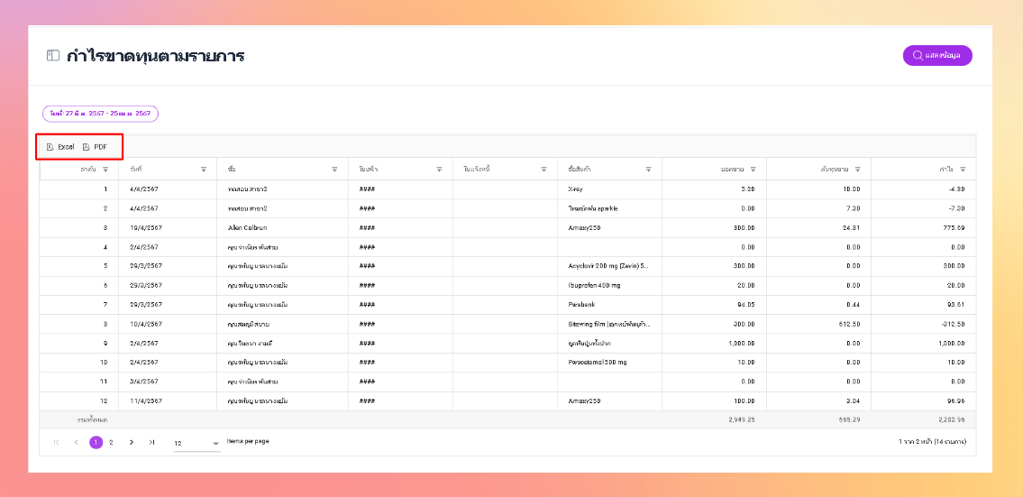 - ระบบจะแสดงข้อมูลกำไรขาดทุนตามรายการ สามารถพิมพ์เอกสารออกมาได้เป็นไฟล์ Excel และ PDF