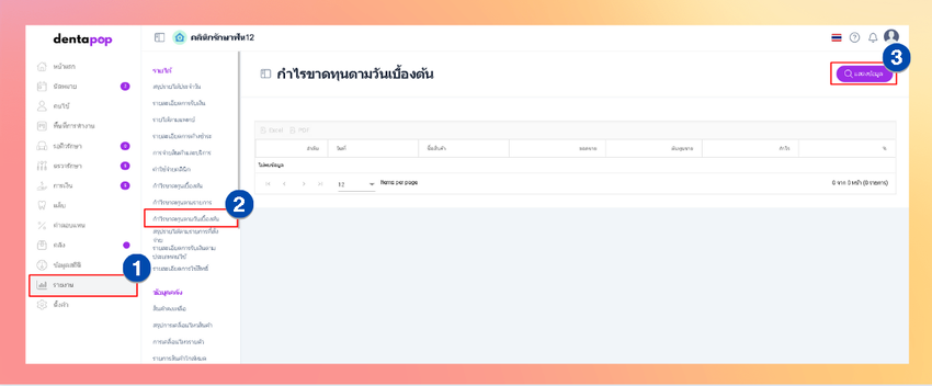ไปที่รายงาน > เมนูรายได้ > กำไรขาดทุนตามวันเบื้องต้น