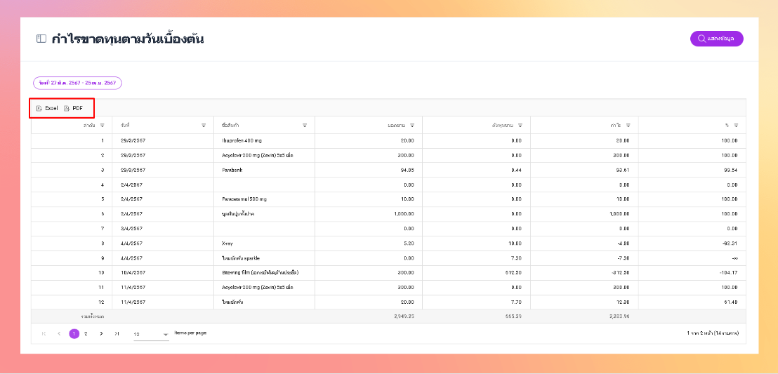 - ระบบจะแสดงข้อมูลกำไรขาดทุนตามวันเบื้องต้น สามารถพิมพ์เอกสารออกมาได้เป็นไฟล์ Excel และ PDF