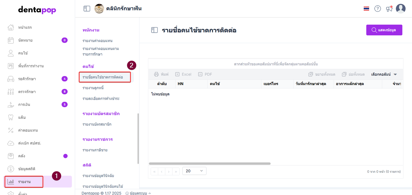 ผู้ใช้งานสามารถตรวจสอบรายชื่อคนไข้ที่ขาดการติดต่อได้ตามขั้นตอนดังนี้