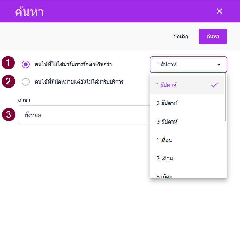 ในรูปภาพตัวอย่างเป็นการเลือก คนไข้ที่ไม่ได้มารับการรักษา เกิน 1 สัปดาห์ ในสาขาทั้งหมด