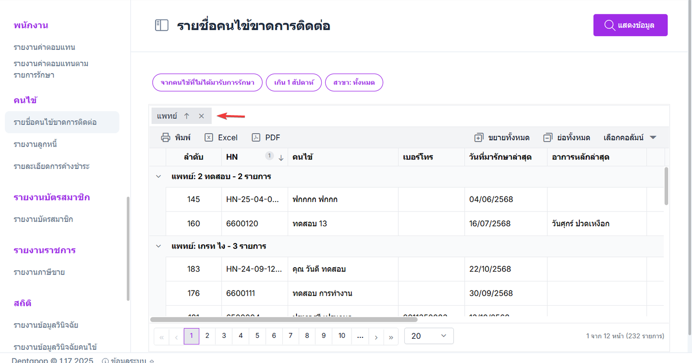ผู้ใช้งานสามารถ ลากส่วนหัวของคอลัมน์ ไปยังพื้นที่จัดกลุ่ม เพื่อจัดกลุ่มข้อมูลตามคอลัมน์ที่ต้องการ เช่น จัดกลุ่มตามแพทย์ หรือวันที่มารักษาล่าสุด