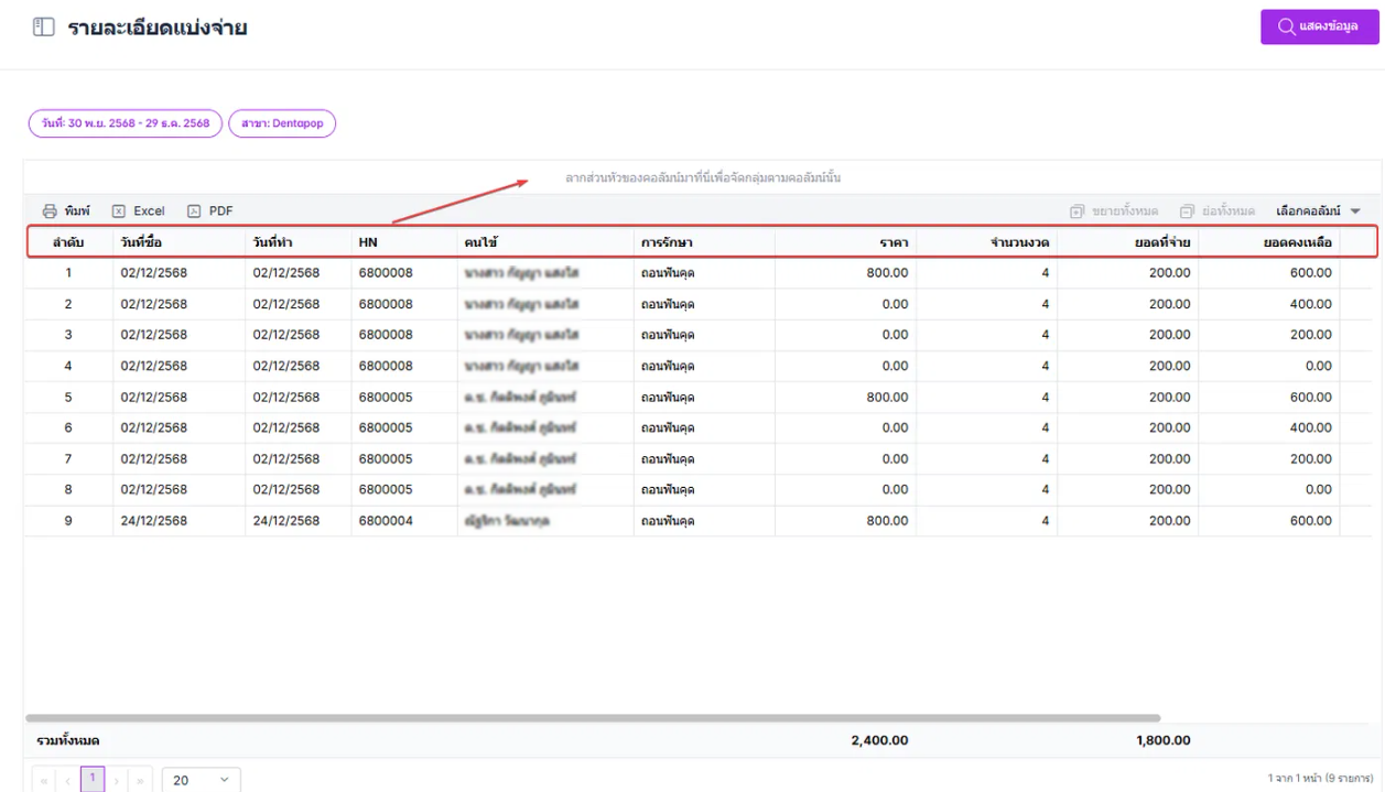 ผู้ใช้งานสามารถลากส่วนหัวของคอลัมน์เพื่อจัดตามกลุ่มของคอลัมน์ได้