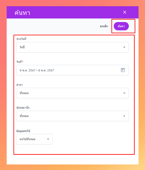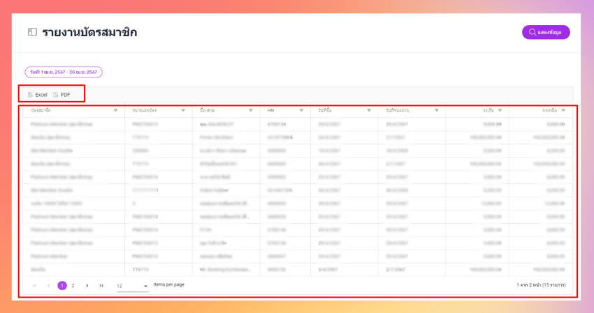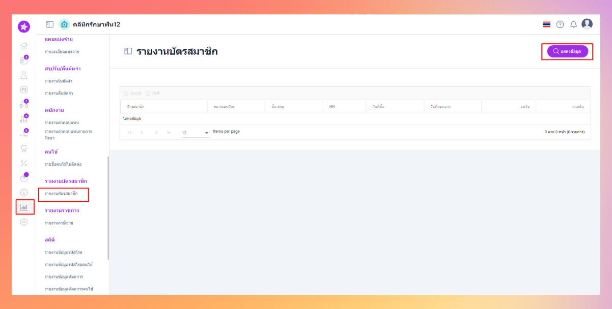 วิธีดูข้อมูลรายงานบัตรสมาชิกไปที่ เมนูรายงาน > รายงานบัตรสมาชิก > คลิกแสดงข้อมูล มุมขวาบน