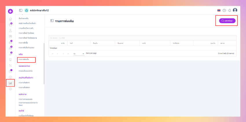 วิธีดูข้อมูลรายการส่งแล็บไปที่ เมนูรายงาน > รายการส่งแล็บ > คลิกแสดงข้อมูล มุมขวาบน