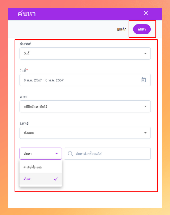 - เลือกช่วงวันที่ วันที่ สาขา แพทย์ และเลือกคนไข้ทั้งหมด หรือค้นหารายบุคคลตามที่ต้องการ