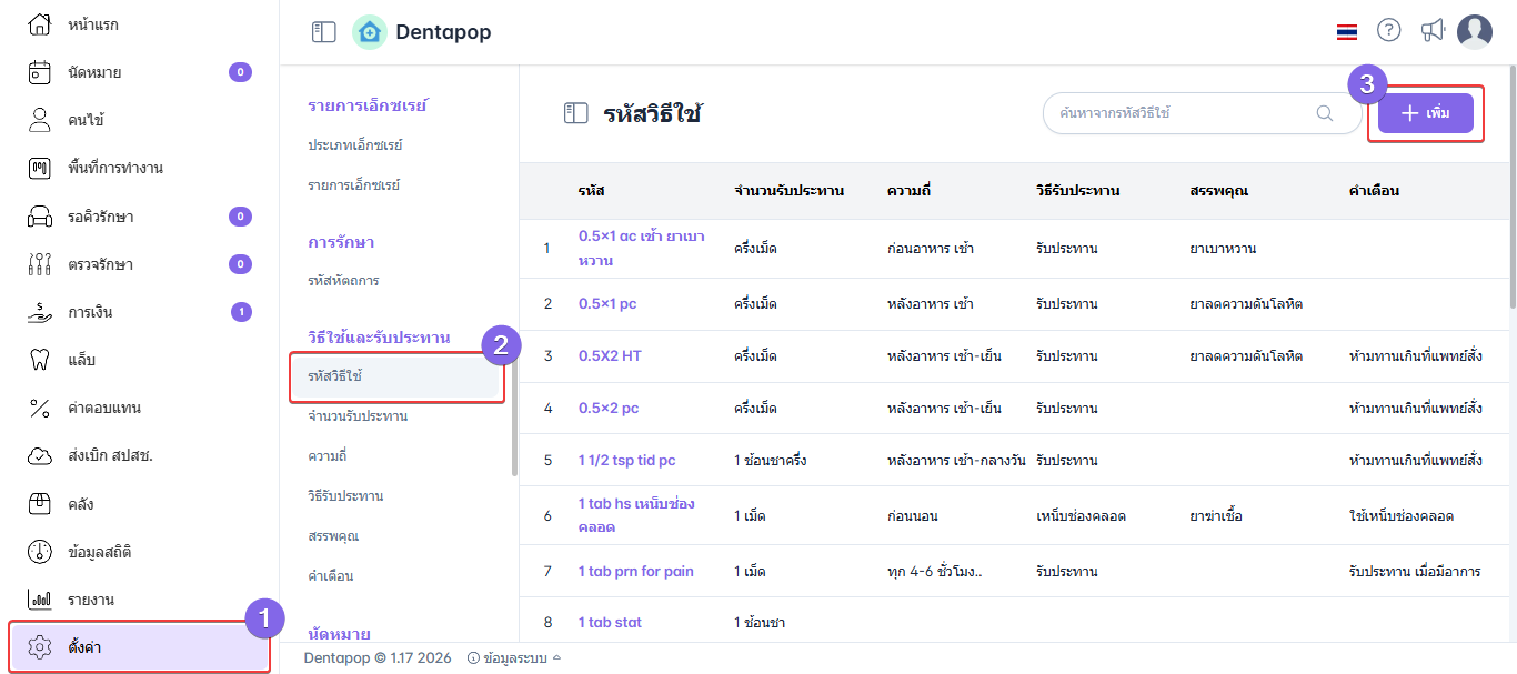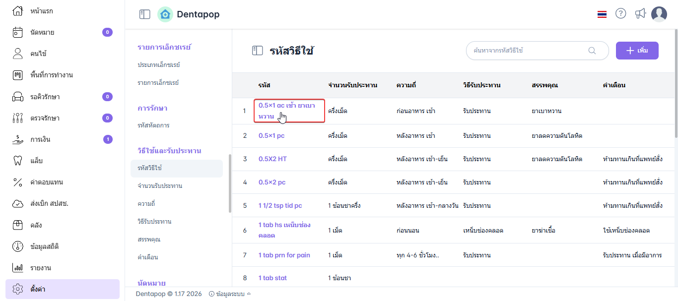 เมื่อผู้ใช้อยู่ในหน้ารหัสวิธีใช้ คลิก เพิ่ม เพื่อทำการเพิ่มรายการรหัสวิธีใช้