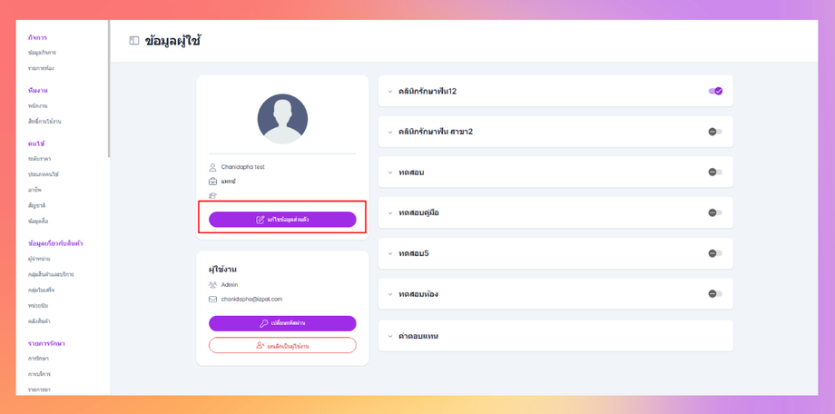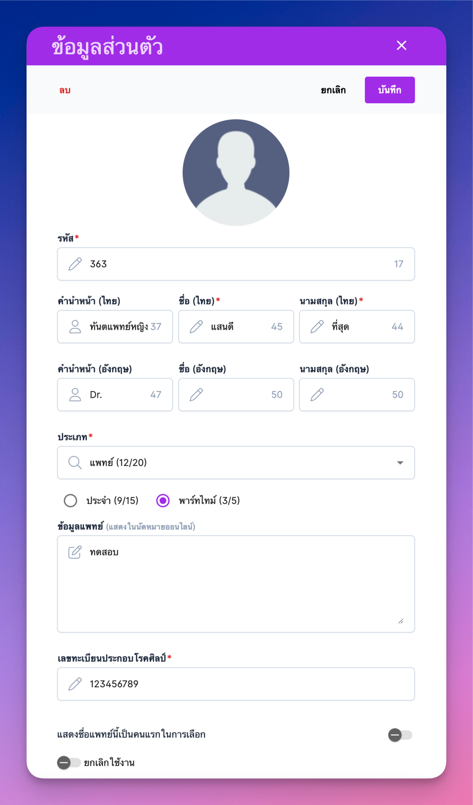 ข้อมูลแพทย์: ข้อมูลแพทย์ในส่วนนี้จะแสดงในหน้าจองนัดหมายออนไลน์ของลูกค้า