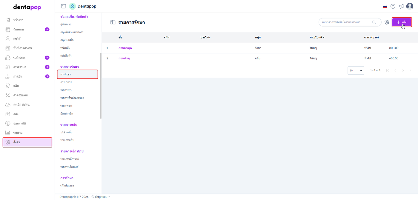 เมื่อผู้ใช้อยู่ในหน้าการรักษา คลิกปุ่มเพิ่ม