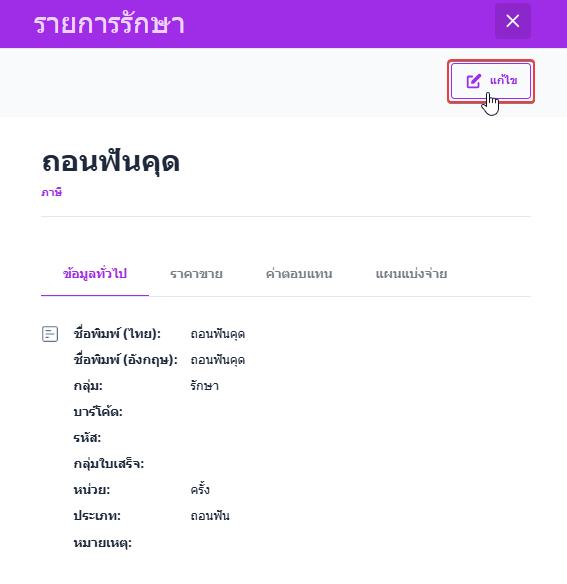 ผู้ใช้งานคลิกปุ่ม แก้ไข เพื่อเปิดหน้าต่างการตั้งค่าแก้ไขรายการการรักษา