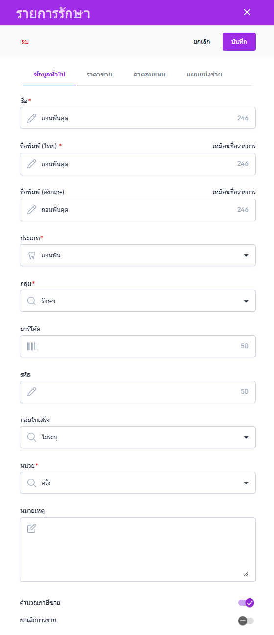 ชื่อพิมพ์ไทย : ชื่อรายการรักษาที่จะแสดงในการพิมพ์ ภาษาไทย เช่น ใบเสร็จ ใบรับรองแพทย์ ฉลากยา