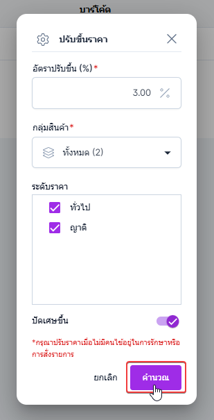 เมื่อระบุรายละเอียดเสร็จสิ้นคลิก คำนวณ ระบบจะคำนวณและปรับราคาขึ้นตาม%ที่ผู้ใช้งานระบุ