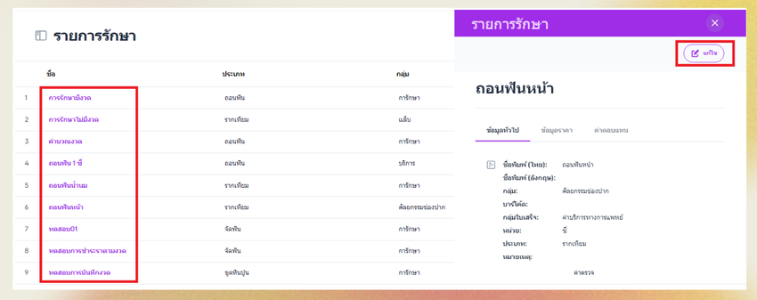 เมื่อเข้าสู่หน้ารายการรักษาเลือกรายการที่ต้องการแก้ไข > แก้ไข