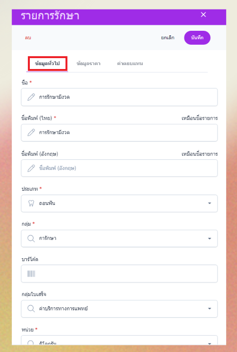 - ชื่อ : ชื่อรายการรักษาที่แสดงในระบบ
