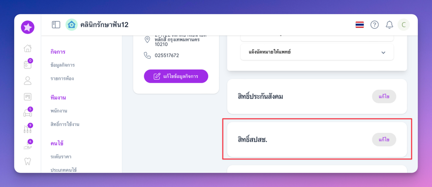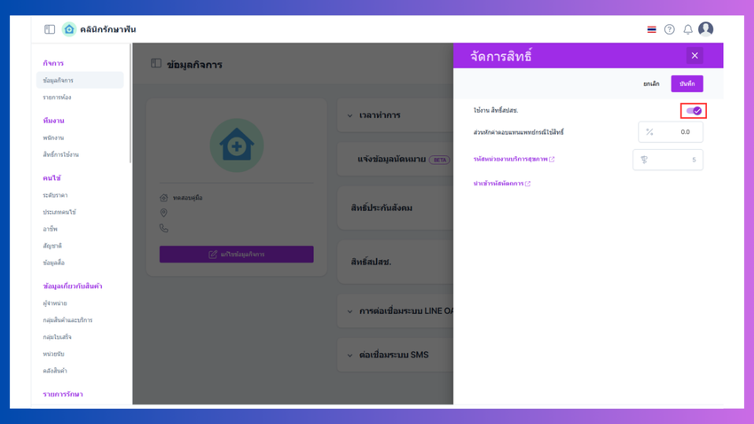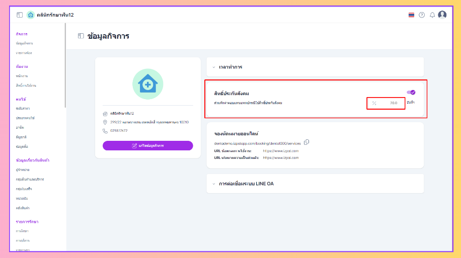 กรณีที่คลินิกต้องการเปิดหรือปิดการรับเงินจากระบบประกันสังคม โดยสามารถคลิก toggle เลือกเปิดหรือปิดระบบการรับบัตรประกันสังคมได้ และหากมีการคิดค่าตอบแทนสำหรับแพทย์โดยการหัก เปอร์เซ็นต์ ในการแบ่ง สามารถกำหนดการได้เพิ่มเติม