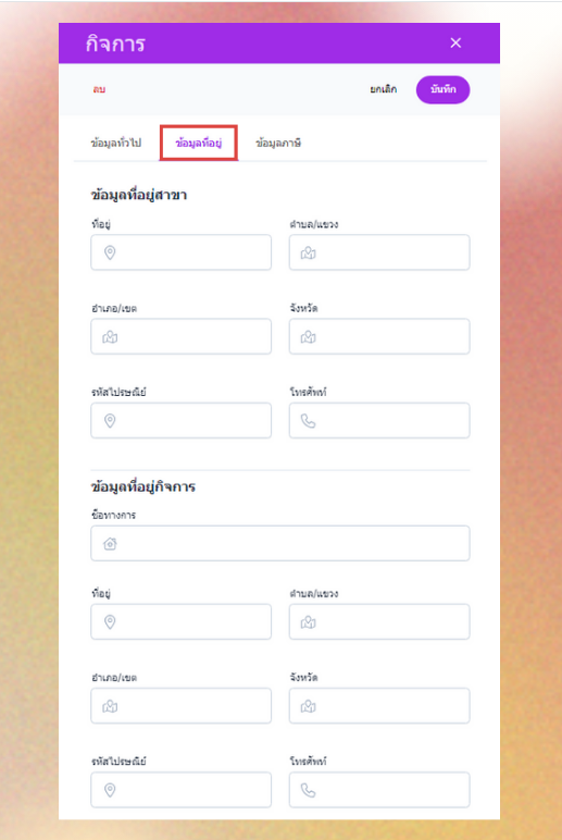 เมื่อเข้าหน้าการแก้ไขกิจการแล้วให้เลือกหัวข้อ ข้อมูลที่อยู่ จะแสดงข้อมูลที่อยู่สาขา และ ที่อยู่กิจการในหน้าเดียวกัน