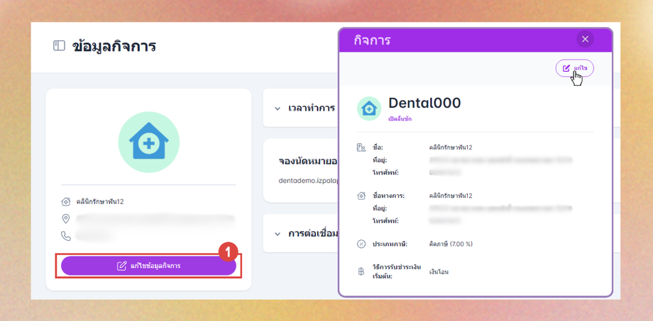 ผู้ใช้งานจะเข้าถึงหน้าข้อมูลกิจการ เลือกแก้ไขข้อมูลกิจการ จะมีหน้าต่างข้อมูลกิจการแสดงขึ้นมาจากนั้น เลือกที่แก้ไข