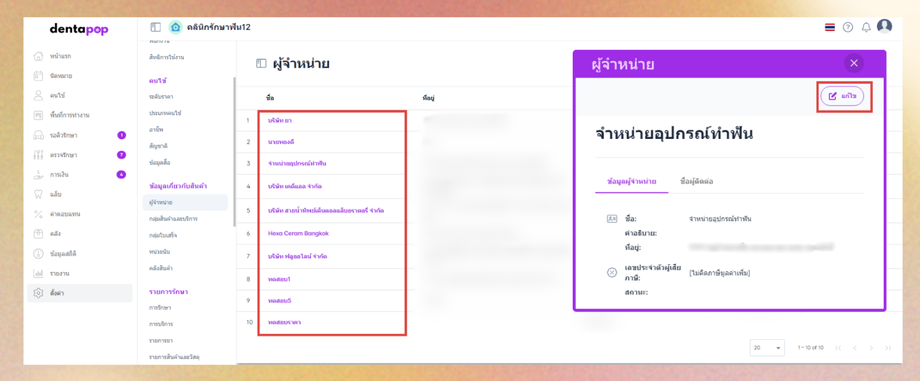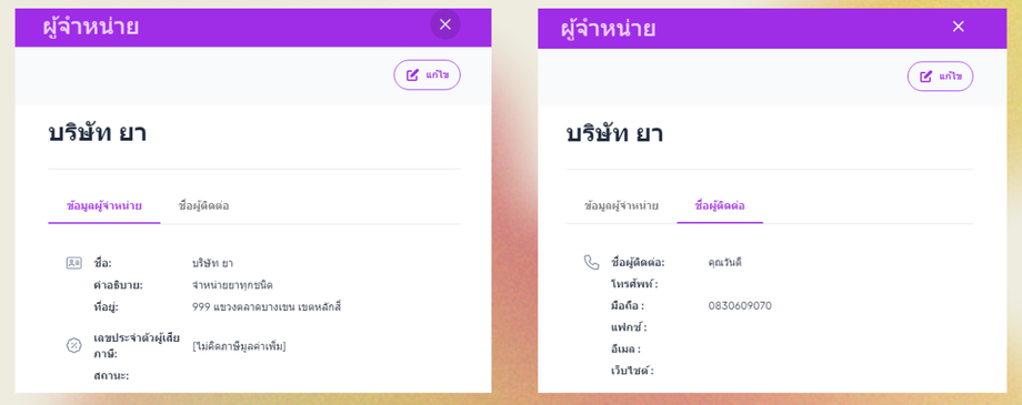เมื่อผู้ใช้อยู่ในหน้าผู้จำหน่าย เลือกผู้จำหน่ายที่ต้องการแก้ไขจะมีหน้าต่างแสดงข้อมูลขึ้นมา > แก้ไข