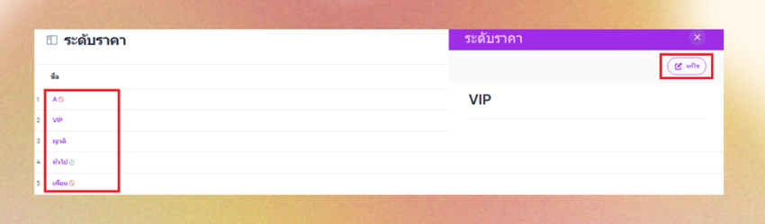 เมื่อผู้ใช้อยู่ในหน้าระดับราคา เลือกระดับราคาที่ต้องการแก้ไขจะมีหน้าต่างแสดงข้อมูลขึ้นมา > แก้ไข