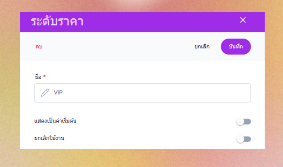 ผู้ใช้งานจะสามารถตั้งราคาสินค้าหรือบริการตามระดับราคาที่ทำการตั้งค่าไว้ได้ใน การจัดการสินค้าและบริการ