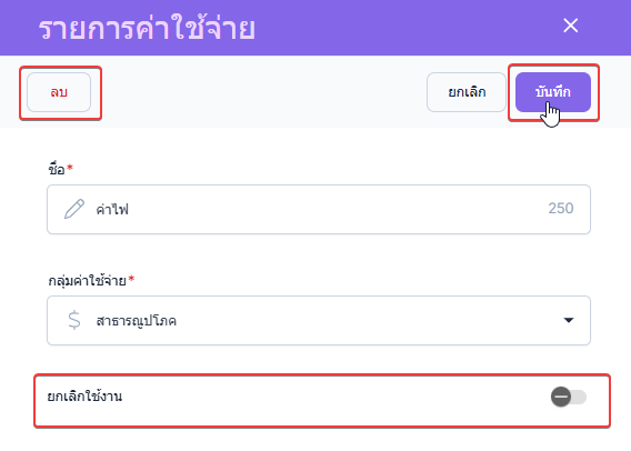 การยกเลิกใช้งาน : คือรายการจะยังอยู่ในระบบแต่แสดงสถานะยกเลิก
