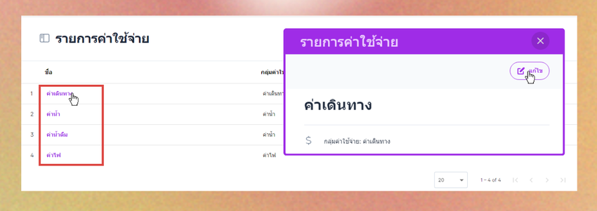 กดคลิกที่ชื่อรายการที่ต้องการแก้ไข ระบบจะแสดงหน้าต่างข้อมูลรายการค่าใช้จ่าย คลิกแก้ไข