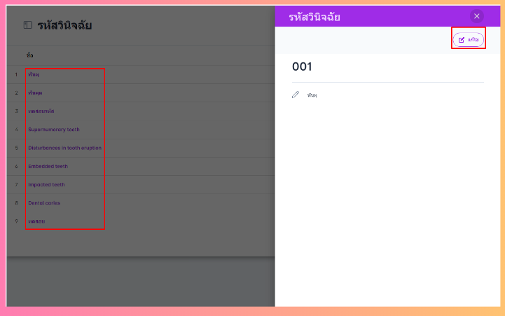ผู้ใช้งานเลือกรายการรหัสโรคที่ต้องการแก้ไข ระบบจะแสดงหน้าต่างข้อมูล จากนั้นคลิกแก้ไข