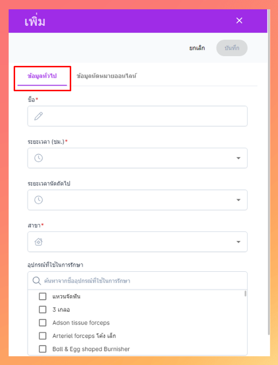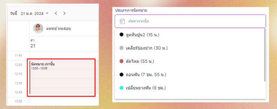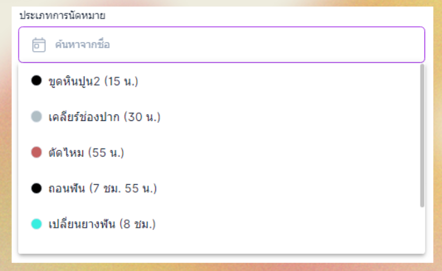 เมื่อผู้ใช้งานตั้งค่าประเภทนัดหมายเรียบร้อย จะถูกใช้งานในส่วนการเลือกประเภทนัดหมาย ในขั้นตอนการเพิ่มนัด